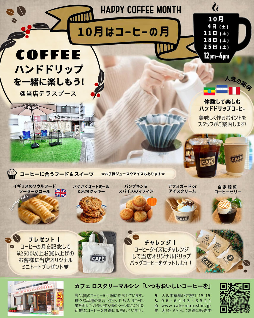 10月の毎週(土)は、当店テラスブースにて、お客様のみなさまと一緒にハンドドリップを楽しむコーヒーイベントを開催します。