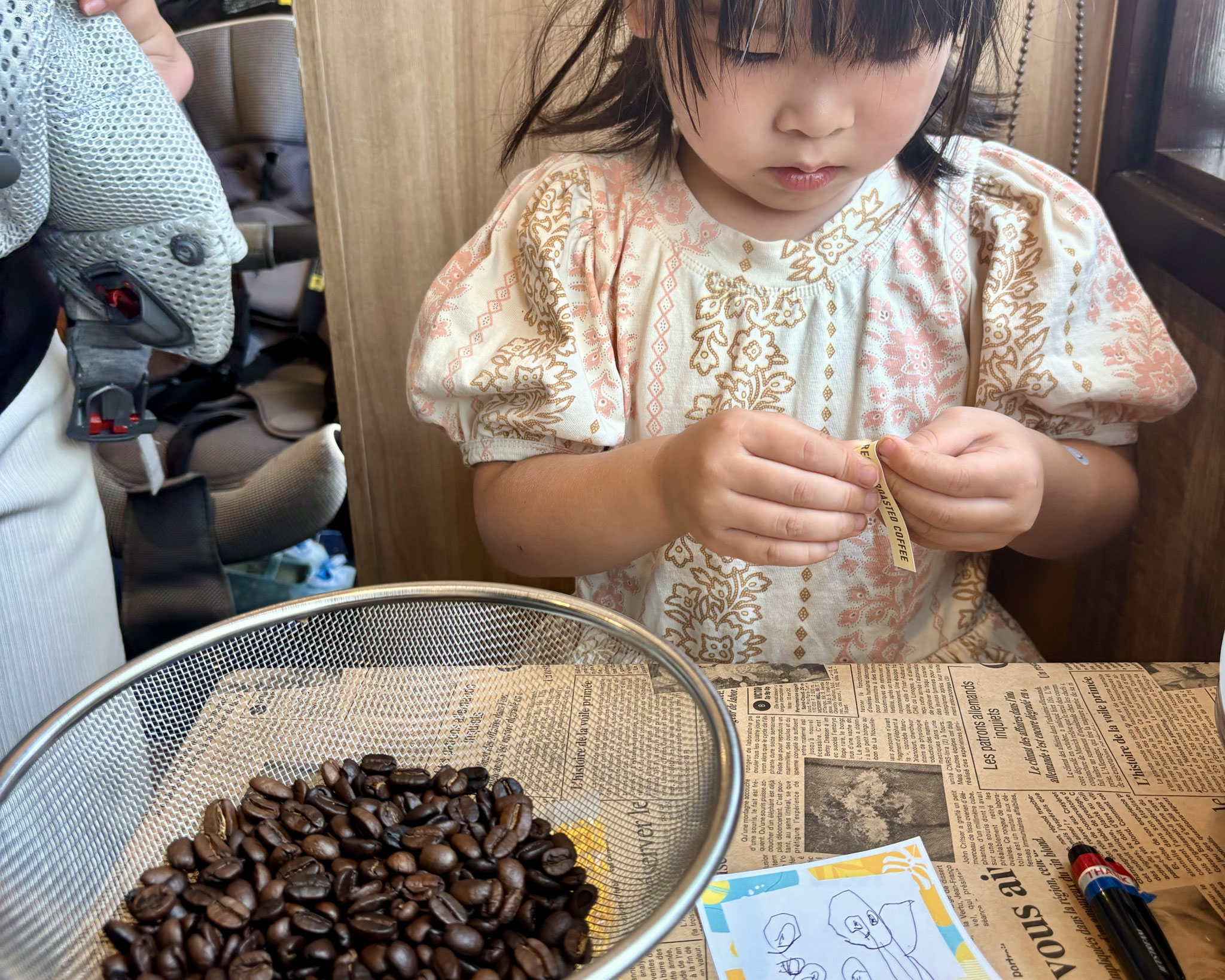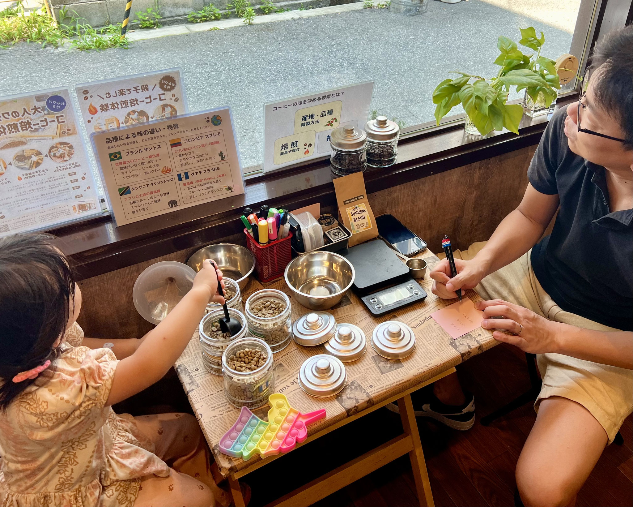 ご家族でご来店いただいたこちらの会では、パパ&4歳のお客様👧🏻でコーヒー焙煎共同作業に挑戦!シャキッと目覚めさせてくれるようなコクのあるフルシティロースト(深煎り)をターゲットに、煎り具合が引き立つような風味を持った生豆をセレクト✨