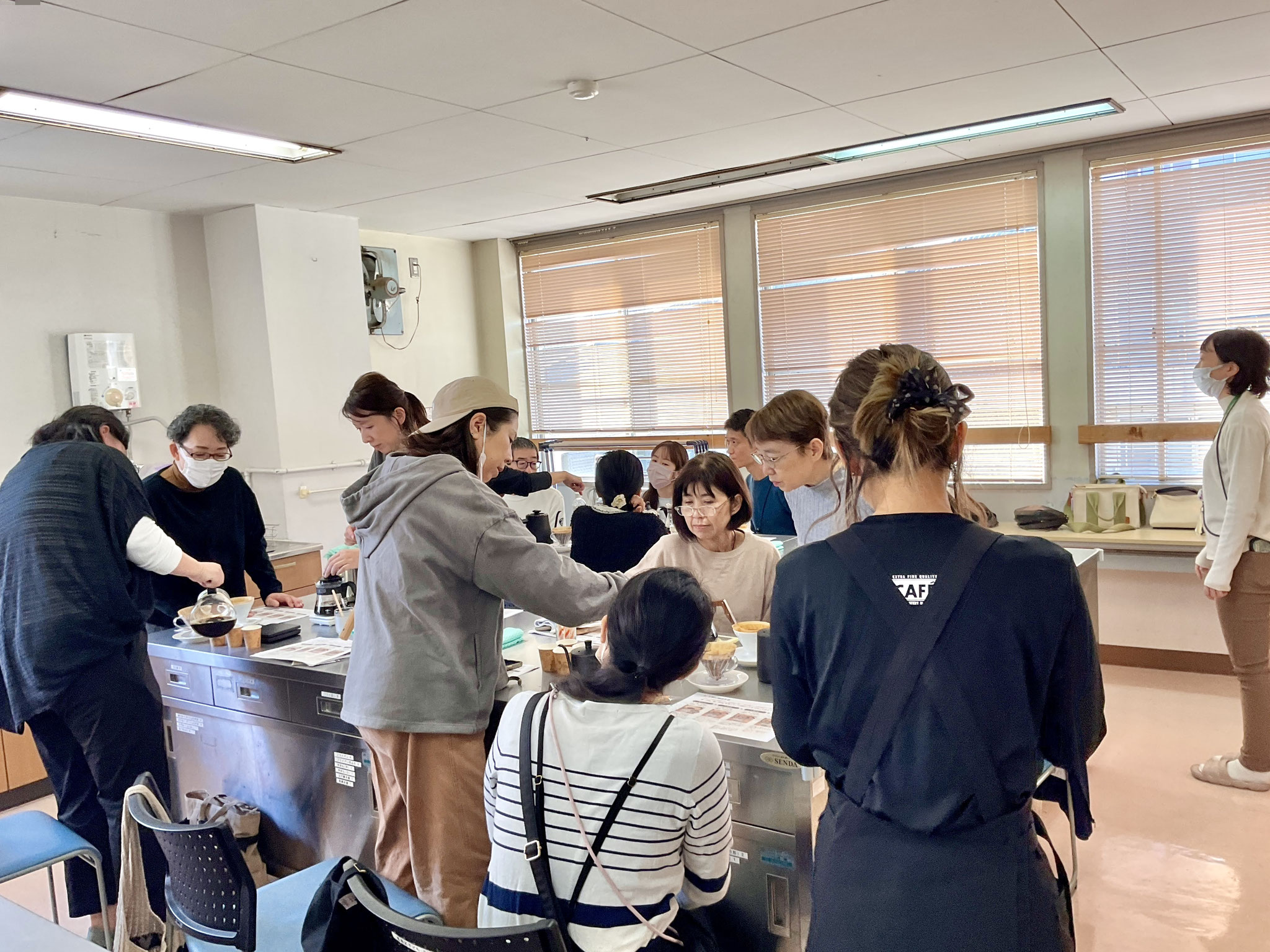 ファミサポ提供会員さんと依頼会員さんが一緒にコーヒーを淹れる時間。コーヒーを通じて、初めましての方やベテランさんがひとつになった時間。皆さまの熱心な表情や和気あいあいとした雰囲気。